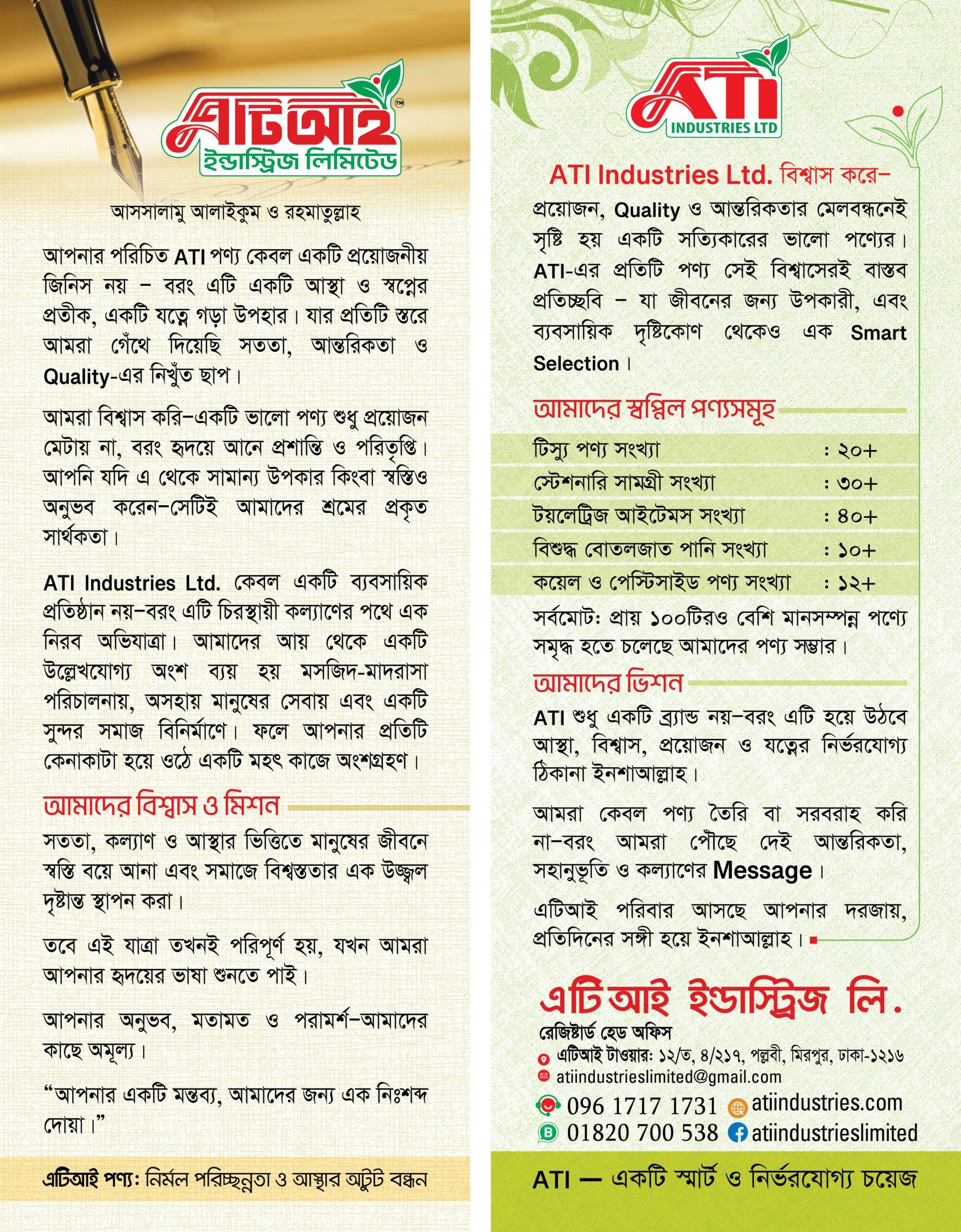 আমাদের প্রতিটি পণ্যে রয়েছে কোয়ালিটির নিশ্চয়তা, আধুনিক প্রযুক্তির ছোঁয়া, এবং সাশ্রয়ী দামে প্রিমিয়াম অভিজ্ঞতা দেওয়ার অঙ্গীকার। টিস্যু, স্টেশনারি, টয়লেট্রিজ, হোম কেয়ার বা বিশুদ্ধ পানীয়—যেখানেই ATI, সেখানেই জেগে উঠছে পরিচ্ছন্নতা ও প্রশান্তির এক নতুন অভিজ্ঞতা।